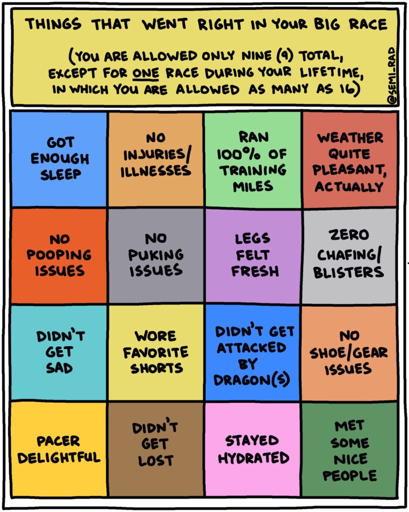 If everything went right every time, where’s the fun in that? Some stories (like almost puking on your delightful pacer’s shoes) are too good to lose.